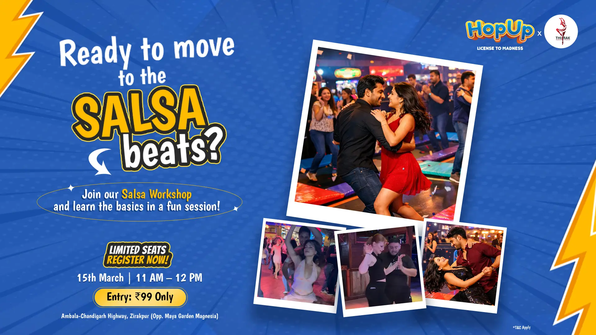 HopUp Chandigarh proudly presents an exciting Salsa Workshop, offering a fun and energetic experience to learn the basics of Salsa in a lively environment. Perfect for beginners and dance lovers looking to groove to the rhythm.